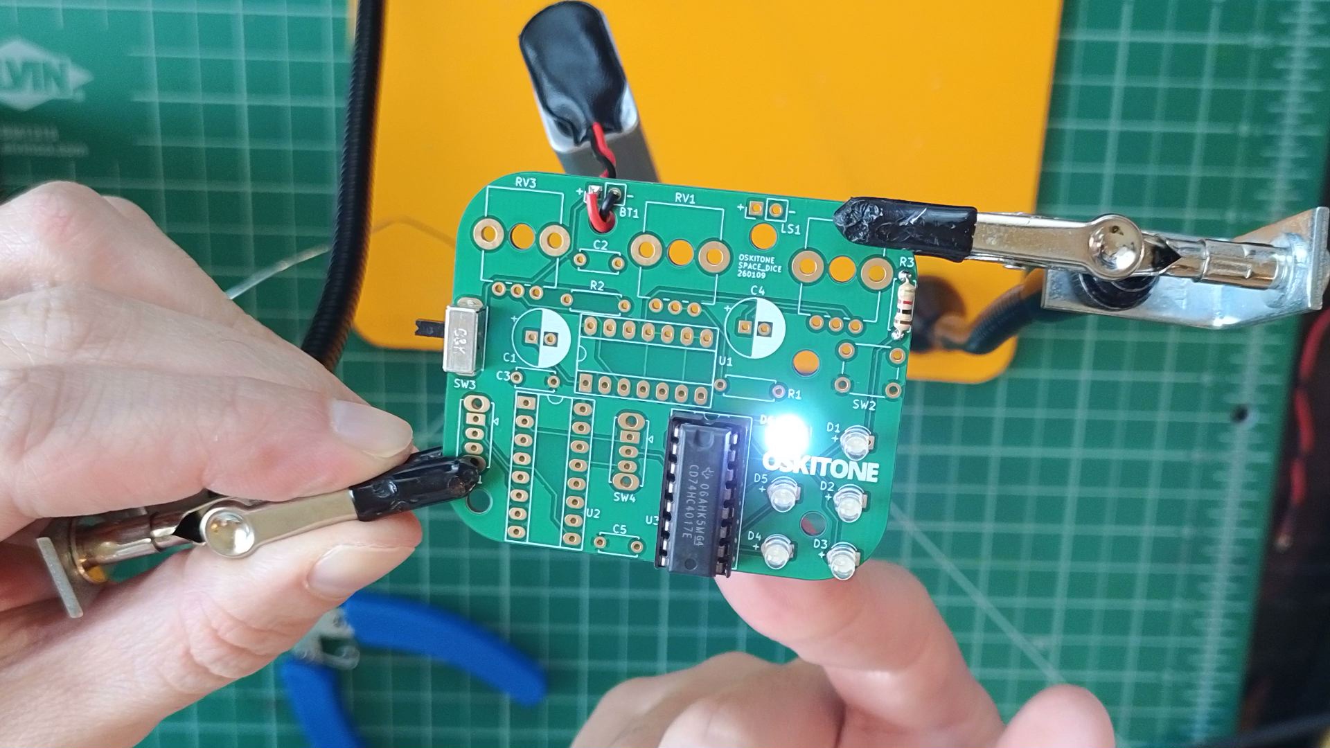 Not working as expected? It's probably a polarity issue. Confirm that the chip and LEDs are all inserted in the right orientation, then check the PCB troubleshooting section. Otherwise, continue.